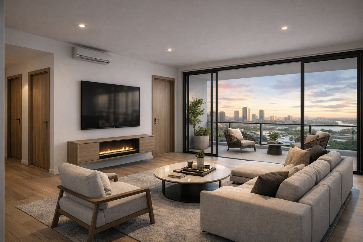 This 2-bedroom condominium design delivers a cohesive, modern living environment that feels spacious despite its compact footprint. Through thoughtful planning, consistent materials, and carefully framed views, the apartment achieves a balance of practical urban living and understated luxury—ideal for professionals, couples, or small families seeking a refined city home.