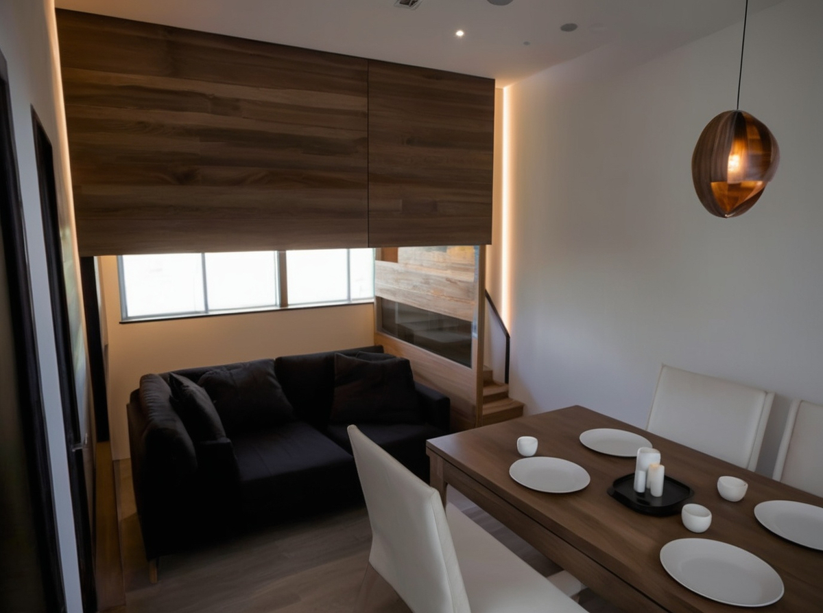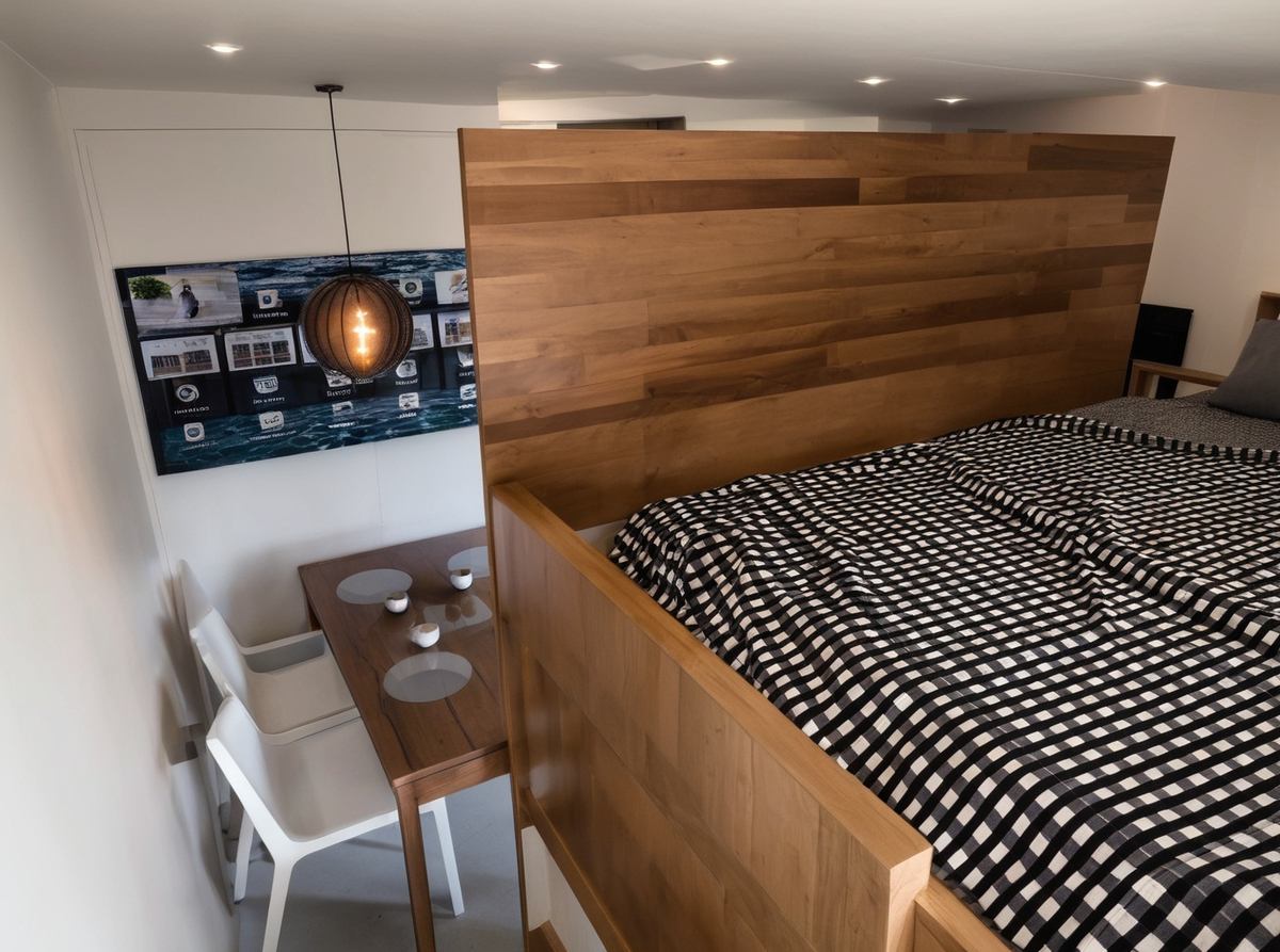 A loft-style sleeping platform maximizes spatial efficiency while maintaining openness in the living and dining area below. The kitchen is defined by a minimalist layout and glass partition, allowing light to flow while keeping functions clearly zoned. Bedrooms adopt a soft, neutral palette with subtle lighting to promote rest.